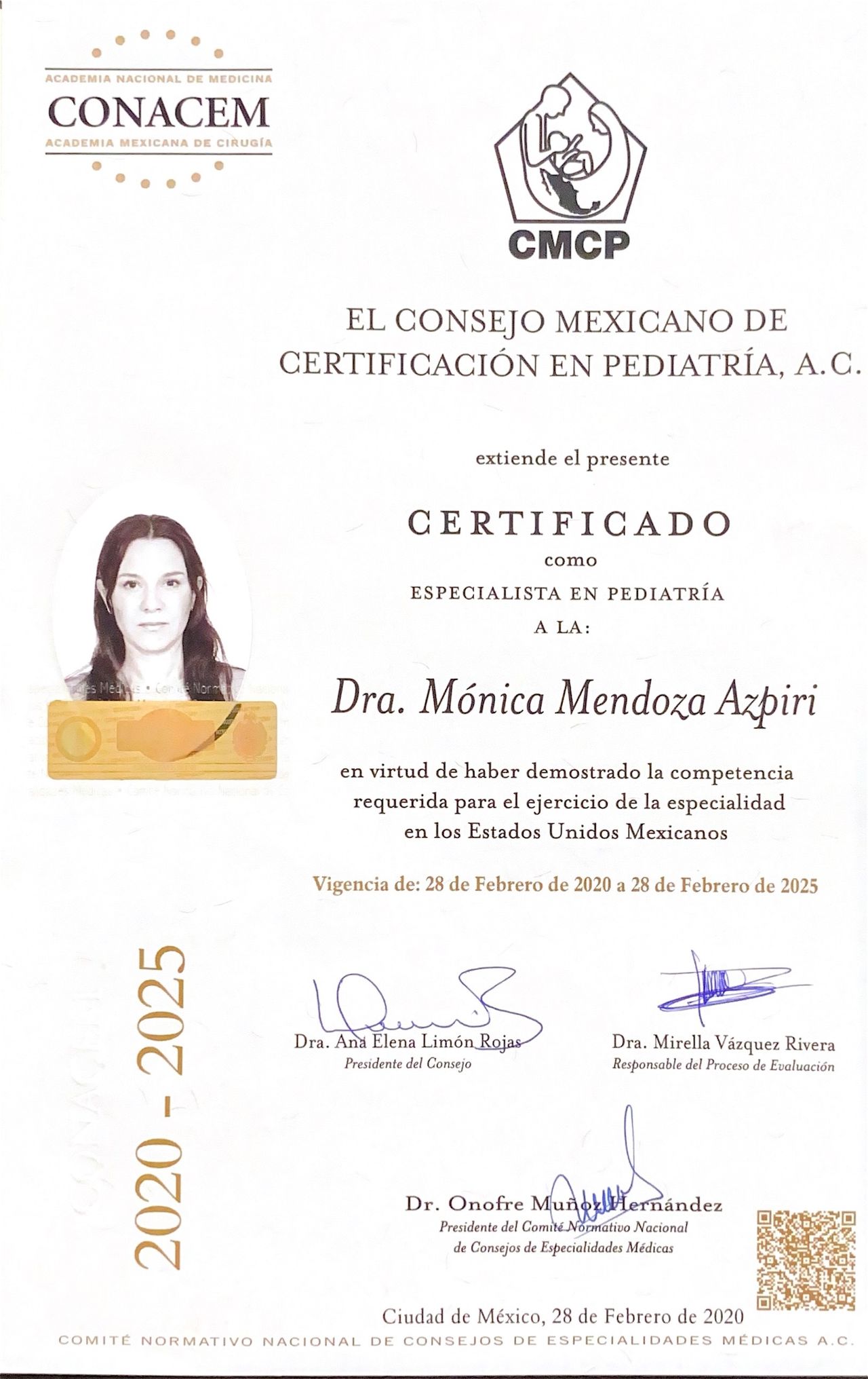 Soy egresada de la Facultad de Medicina de la Universidad Nacional Autónoma de México (UNAM) y especialista en Pediatría por el Hospital Infantil de México Federico Gómez, con una trayectoria de más de 22 años en la práctica pediátrica privada.